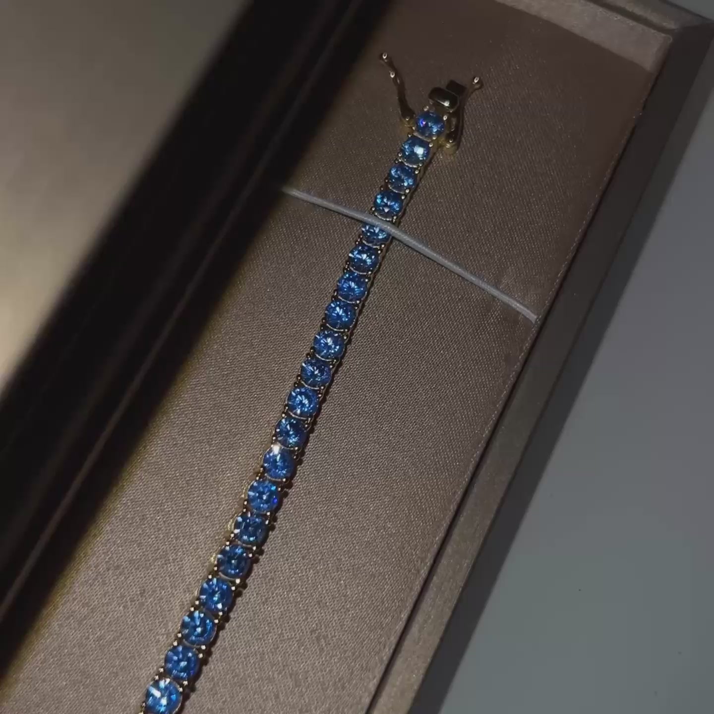 Un exclusivo brazalete tipo tenis con baño de oro y piedras de circonita cúbica azul de corte redondo. Su mecanismo de cierre ofrece mayor seguridad en comparación con los cierres tradicionales, brindando comodidad y estilo.